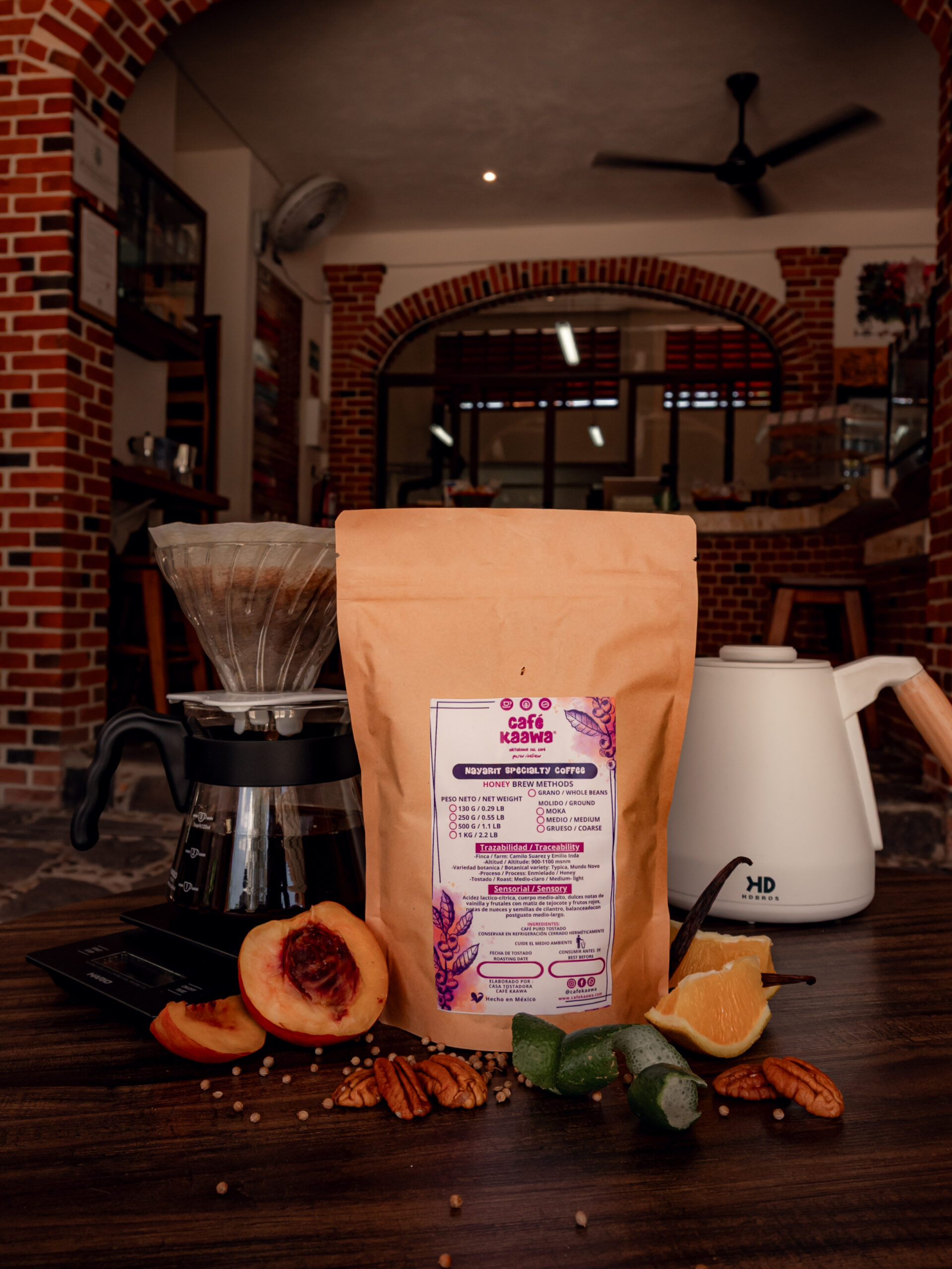 - Aroma: Notas frutales de cítricos con matiz de lima, frutos con hueso con matiz de tejocote, melocotón y notas de nueces y semillas de cilantro